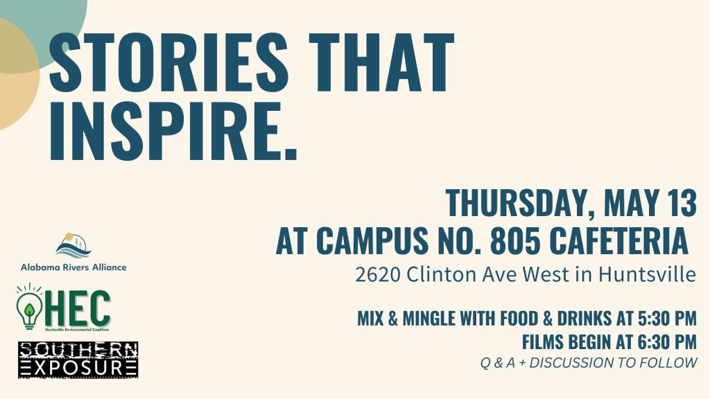 Join Alabama Rivers Alliance and Huntsville Environmental Coalition for the FREE screening of the NEW Southern Exposure Films! Don’t miss this eagerly awaited night of storytelling that will inspire, ignite and unite us all as we work together protect Alabama’s waterways, communities, land and air.